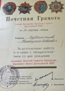 1940-пе исалас 1952-пе исасттегьен илгуне ме ГIенкIлагъарин хIуриъ. (ДегIви хъучучIугуна мис кканхьуне учра вес, амма Хеварин военкомат ме тич гьикас рази хьундавакомисоват акьуне. Ппара дард кей уйи агъа Магомедрагимас ме кардикес. Ми, учифас вере кар аркьай, кумак йине хIуькуматдис.) Мин аркьа кардил джалла разиди уйи: райондин хIаттара, хIуринттара. Ми йиркIв фай кар аркьахIела, райкомпартин хIаттари 1952-пе иса Курбанисмаилов гьикуне МахIачкъалайиди Высший партийный школайиди. 1954-пе иса, ккиркIуна тевусра, адине Магомедргим райондиди. Райкомдин хIаттари мис тапширмиш акьуне колхоздин председательвел акьуб. 1954-исан хаб 1965-пе исасттегьен ме чиппин хIурин «Ким» агъа колхуздин председательвел аркьай уйи. Ме кар аркьа исари, сасра хIурарин колхузарин къабахъ хъая колхоз, ке удигьаф хьуне учин агалкьунарилди. Магомедрагим двадцатипятитысячникар агъаттрикес сад и. Ме кIилил алди «Ким» агъа колхуз райондиъ кидай- республикайин «Доска почета»-йиди аттархьуни. 1956-пе- 1959-пе исари ме колхоздин ппара Iайи ттур ай уйи.(Гьеме исари и ме «Дока почета»-йиъ аяф). Колхуздиъ кар аркьай, Курбанисмаилова сельхозинститутра ккиркIуни, Бакуйиъ высший партийный школара.
