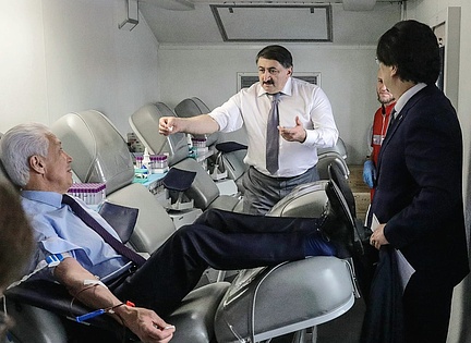 Одними из первых мобильную станцию переливания крови посетили руководитель фракции партии «Единая Россия» Владимир Васильев и его коллега из Дагестана Джамаладин Гасанов.
