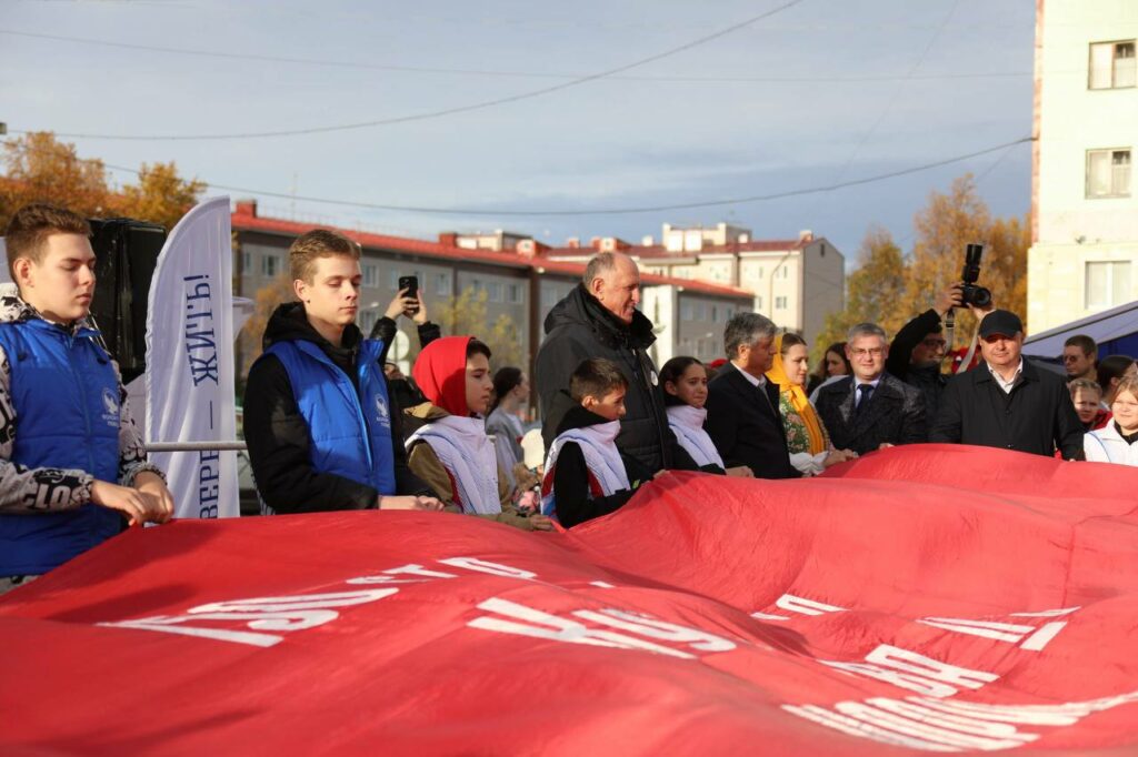 Премьер-министр республики вместе с участниками Движения Первых и Юнармейцами, а также жителями города на центральной площади развернул большую копию Знамени Победы, водруженного над Рейхстагом в мае 1945 года.