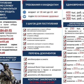 Кроме того, все подписавшие контракт будут обеспечены всем необходимым обмундированием для прохождения службы в зоне СВО. Общая единовременная выплата составит более 1 200 000 рублей. Из них: — 500 000 рублей – от Республики Дагестан; — 400 000 рублей из федерального бюджета; — 300 000 рублей от города Махачкалы; зарплата контрактника – от 210 тыс....