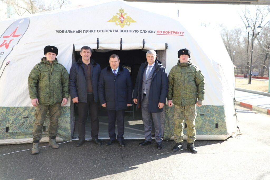 Глава Кизлярского района Аким Микиров посетил мобильный пункт отбора на военную службу по контракту в Вооруженные силы РФ. Шатер развернули на территории городского парка рядом со зданием МФЦ.