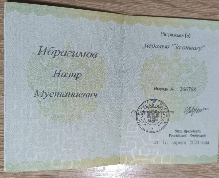 За мужество и отвагу, проявленные при выполнении специальных заданий по обеспечению государственной безопасности при защите конституционных прав граждан в условиях, сопряжённых с риском для жизни, участник специальной военной операции из селения Гостала Казбековского района Назир Ибрагимов награжден медалью «За отвагу».