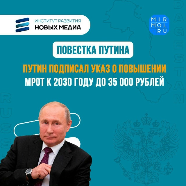 Президент России Владимир Путин подписал указ «О национальных целях развития Российской Федерации на период до 2030 года и на перспективу до 2036 года», устанавливающий цель по повышению минимального размера оплаты труда до 35 000 рублей к 2030 году.