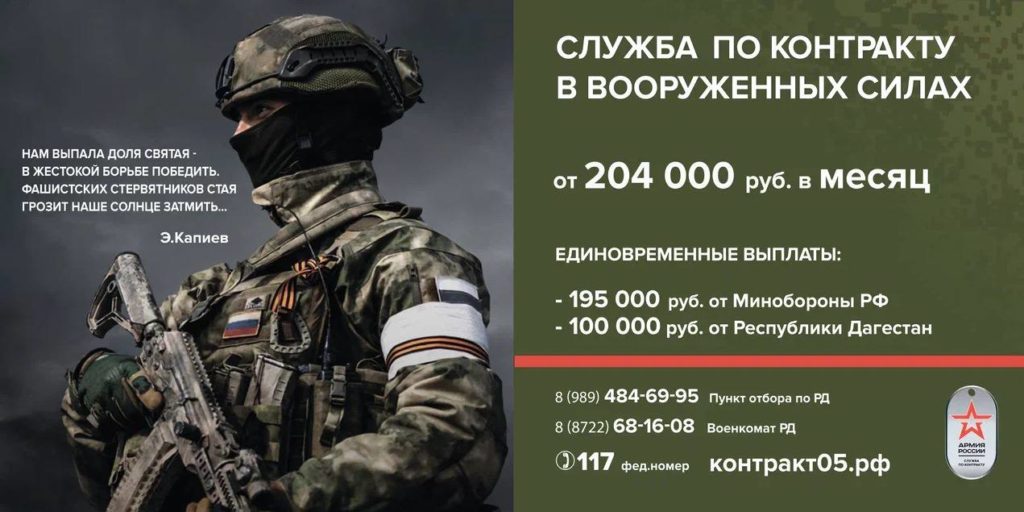 При заключении контракта дагестанцы единовременно получают около 300 тысяч рублей (с учетом региональных выплат), минимальная ежемесячная зарплата военнослужащего составляет 204 тысячи рублей.
