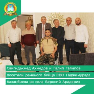 Заместитель Председателя Народного Собрания РД Сайгидахмед Ахмедов и глава МР «Гумбетовский район» Галип Галипов 21 мая 2024 года посетили раненого бойца СВО, морского пехотинца Каспийской флотилии Гаджимурада Казанбиева из села Верхний Арадерих. Сайгидахмед Ахмедов вручил Казанбиеву конверт с денежным вознаграждением и заверил его, что региональная власть поддержит бойца на постоянной основе. Заместитель Председателя НС РД...