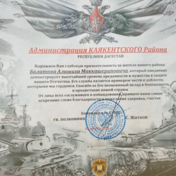 Глава Каякентского района Магомед Эльдерханов получил благодарственное письмо от командира в/ч 31985 гвардии полковника С.Житкова, в котором он выражает глубокую признательность за жителя с.Каранайаул Каякентского района Болатова Алишиха Маккашериповича, ежедневно демонстрирующего высочайший уровень преданности и мужества в защите Отечества. «Его служба является примером чести и доблести, которыми мы гордимся. Спасибо за Его неоценимый вклад в...