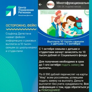 В соцсетях активно распространяется информация о якобы ожидающихся выплатах в 10 тысяч для семей со школьниками и студентами. Все, что нужно сделать, успеть подать заявку и перейти по ссылке. Специалисты ЦУР Дагестана обратились в региональное отделение Социального фонда России. В ведомстве заявили, что информация не соответствует действительности. «Данная информация не соответствует действительности, проще говоря —...