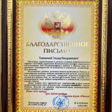 Командование и личный состав добровольческого отряда «Пламя» выразил благодарность Комплексному центру социального обслуживания населения Хасавюртовского района, за поддержку и оказанную гуманитарную помощь. Отметим, что 1 декабря представители Комплексного центра социального обслуживания населения Хасавюртовского района во главе с директором Эльдаром Гаджиалиевым выехали в зону СВО г. Мариуполь с целью оказания гуманитарной помощи в виде предметов первой...