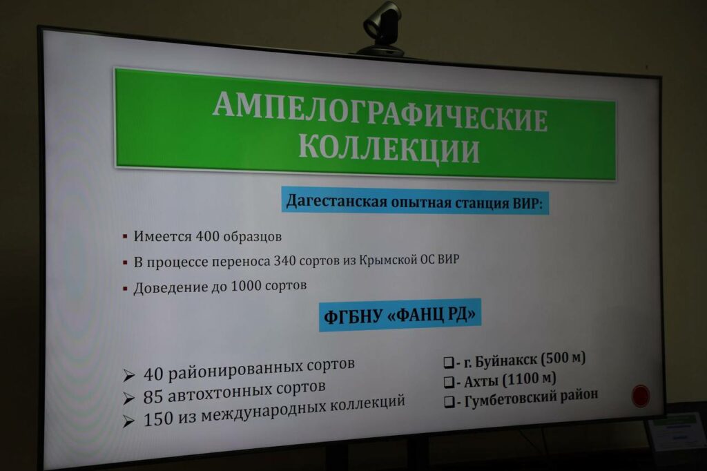 На межведомственном совещании и.о. директора Федерального аграрного научного центра Дагестана Нариман Ниматулаев сообщил о переносе ампелографической коллекции с Крымской опытной станции ВИР на Дагестанскую опытную станцию. Сейчас местная коллекция насчитывает 400 образцов, уже заложено еще 300 сортов из Крыма. К 2027 году общее количество сортов планируют довести до тысячи.
