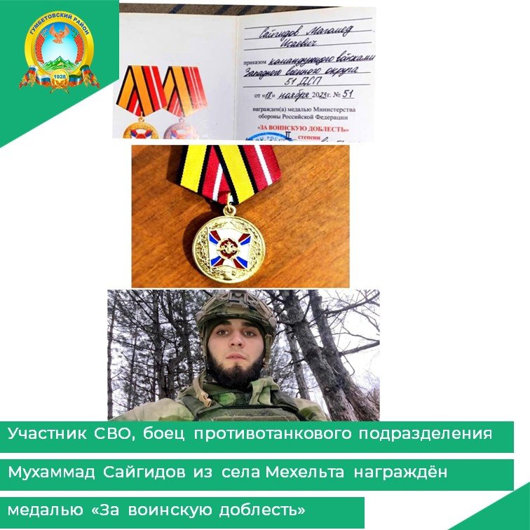 Участник спецоперации по денацификации и демилитаризации Украины, воин противотанкового подразделения Мухаммад Сайгидов из села Мехельта награждён медалью «За воинскую доблесть» II степени.