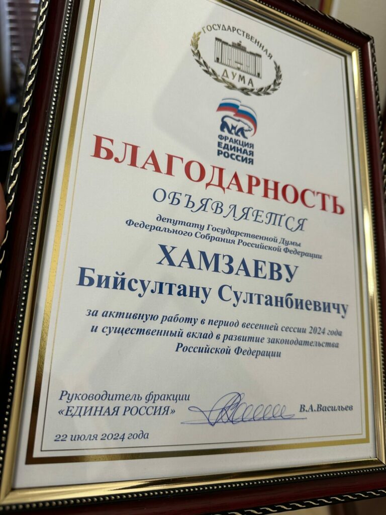 По результатам работы за полгода руководитель Фракции «Единая Россия» Владимир Васильев поблагодарил депутата Государственной Думы Султана Хамзаева «за активную работу в период весенней сессии 2024 года и существенный вклад в развитие законодательства Российской Федерации».