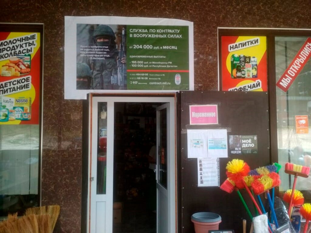 Наряду с этим в общественных местах сельских поселений расклеиваются листовки, содержащие основную информацию о поступлении на военную службу по контракту, требованиях к кандидатам, перечне документов, ежемесячных выплатах, социальных гарантиях и льготах. На листовках также указаны контактные данные пунктов отбора на военную службу. Кроме того, на въезде в село Маджалис установлен билборд, призывающий вступить на службу в добровольческий батальон «Каспий», небольшие баннеры размещены и на стенах госучреждений сел муниципалитета.