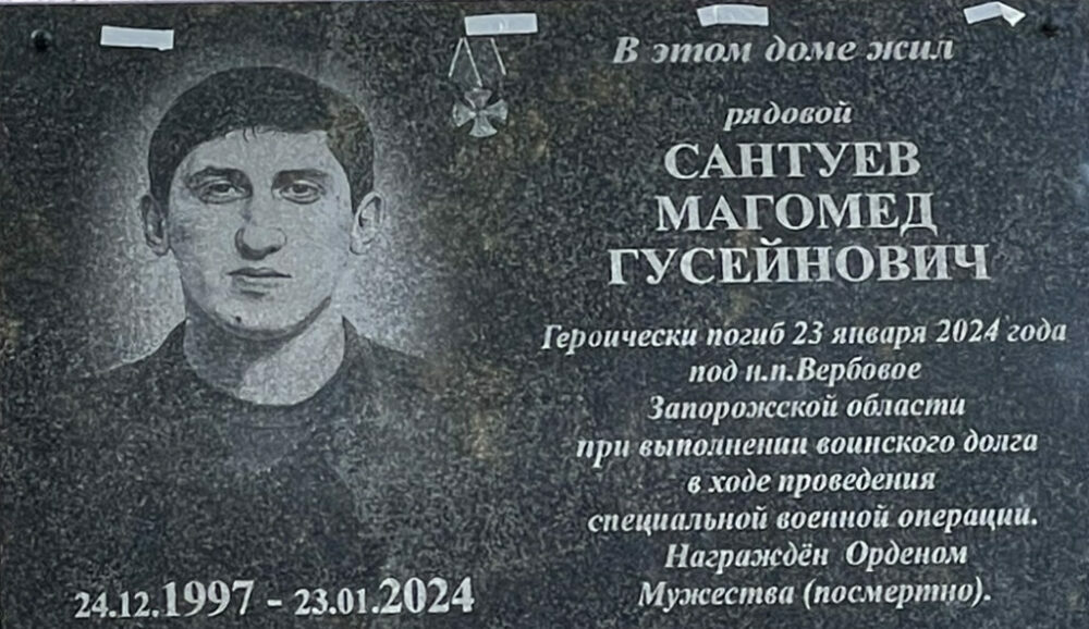 15 ноября, по ул. Шамиля, 54 г. Махачкалы прошло открытие мемориальной доски в память о кавалере Ордена Мужества Магомеде Сантуеве, погибшем в ходе специальной военной операции.