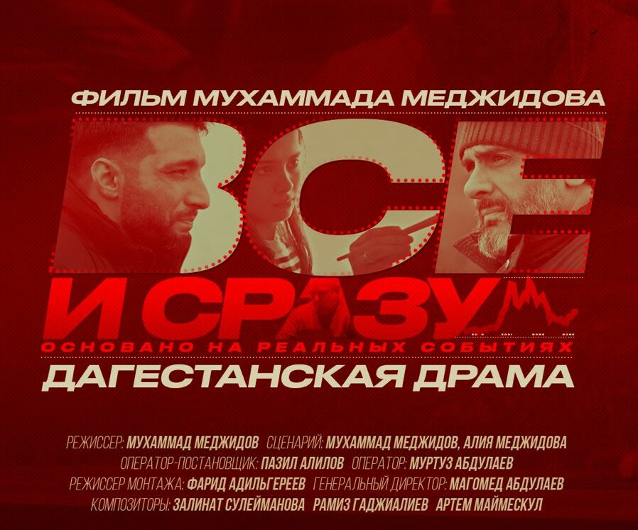 20 декабря в 19:00 в кинотеатре «Синема Холл» пройдет закрытый показ художественного фильма «Все и сразу». Проект создан дагестанской киностудией «Студия136». Мероприятие проходит при информационной поддержке Министерства культуры РД. Драма «Всё и сразу» ориентирована поднимает вопросы духовно-нравственного воспитания молодого поколения. В картине приняли участие именитые артисты республиканских театров, в числе которых Имам Акаутдинов и Камиль Джамбуков. В картине также приняла участие и Заслуженная артистка Татарстана Елена Ненашева. А ключевым событием проекта является одна из главных ролей в исполнении подопечной Специальной коррекционной школы-интерната для глухих детей Камилы Амирхановой.
