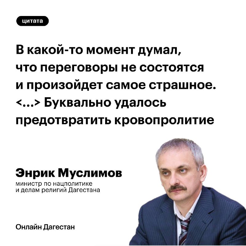 Министр по национальной политике и делам религий Дагестана Энрик Муслимов, который вел переговоры с участниками беспорядков в аэропорту Махачкалы, заявил, что 29 октября удалось предотвратить кровопролитие.