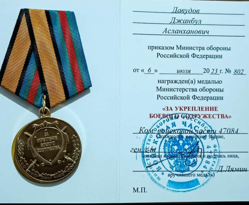 Участник специальной военной операции из с.Калининаул Джанбул Давудов награжден второй воинской наградой – медалью Минобороны РФ «За укрепление боевого содружества». Напомним, ранее Давудов был удостоен медали «За храбрость II степени».