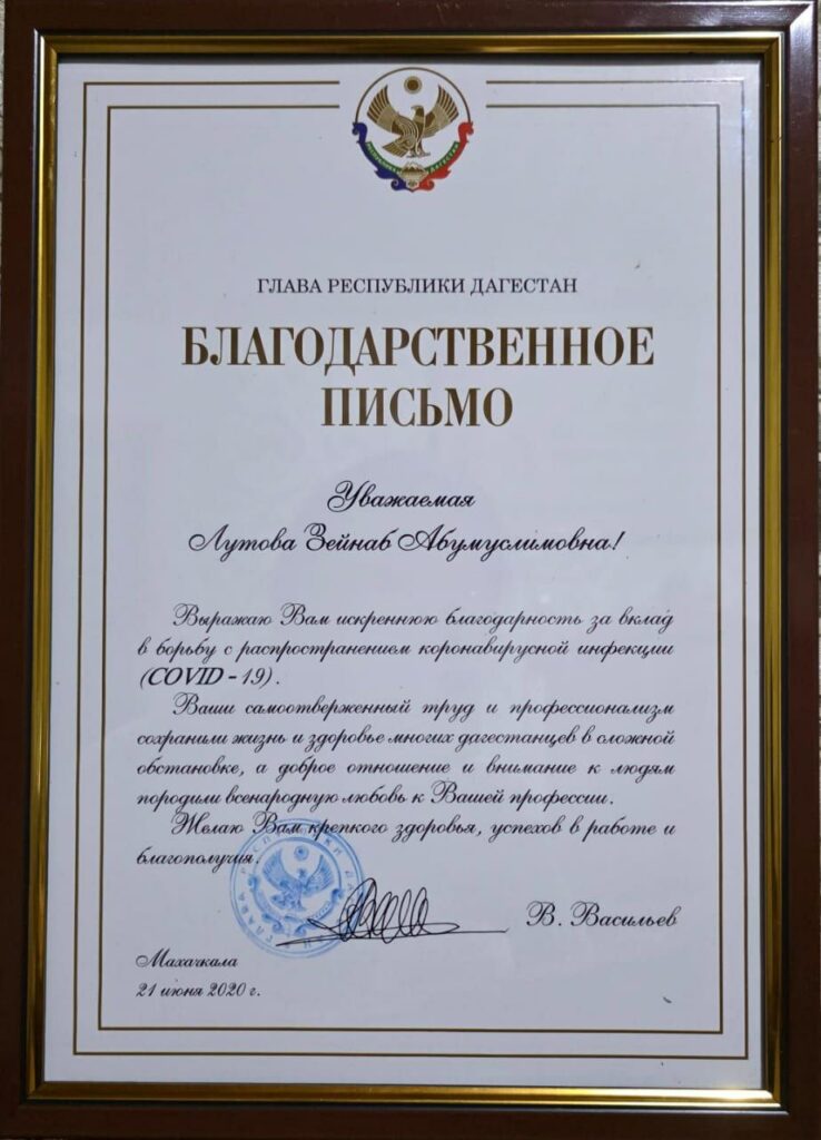 За самоотверженный труд Зейнаб Абумуслимовна получила благодарственное письмо, но главная награда для нее — здоровые дети и благодарность родителей. Зейнаб Лутова — пример настоящего доктора, для которого медицина не просто работа, а дело всей жизни. Ее история показывает, что хорошим врачом становится не тот, кто просто получил диплом, а тот, кто с детства понимает: помогать людям — это счастье. И пока такие врачи, как Зейнаб Абумуслимовна, стоят на страже здоровья наших детей, мы можем быть спокойны: в их руках — будущее.