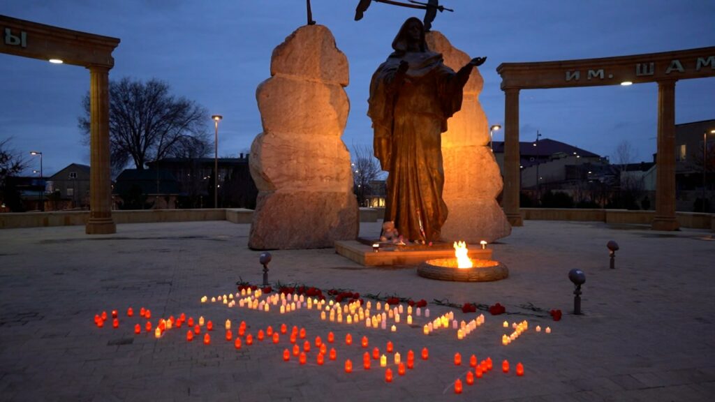 Жители Дербента несут цветы в парк «Боевой славы» к мемориалу «Скорбящая мать», чтобы почтить память жертв террористического акта в «Крокус сити холл».